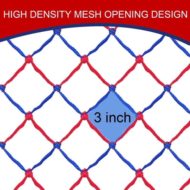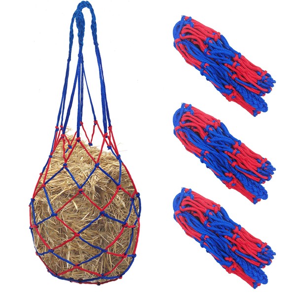 WEISGJA 3 PCS Slow Feed Hay Bag Hay Net for Horses,Goats,Sheep,Donkey 33 Inch Length with 3 x 3”Mesh Holes Livestock Supplies Hanging Hay Nets for Trailer and Stall (Blue+Red)
