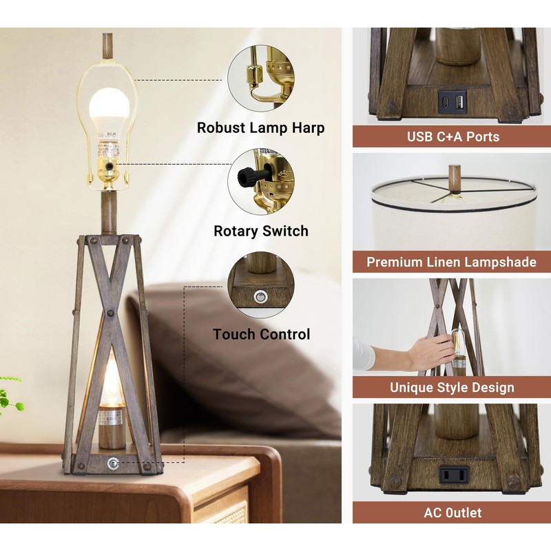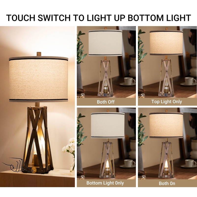 - 【2 Lights Design & Smart Touch Control】:WEITERS unique farmhouse table lamp provides multiple lighting options: only top light on, only night light on, both on, both off. Featuring a 2-way rotary switch for the upper lights and a 3-way dimmable control for the lower lights, just touch the lamp base button, you can adjust the lighting as per your needs. The upper and lower lights can be turned on together for maximum lighting range. This lamp is perfect for bedtime, studying or playtime
