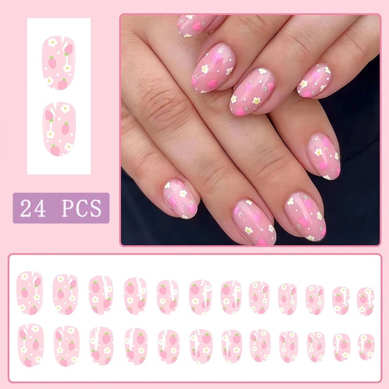 24Pcs Strawberry White Floral Fake Nails Pink Press on False Nails Cute Artificial Nails for Women Girls Nail Art Decorations Package Includes: -24pcs floral strawberry press on nails. -24pcs jelly glue stickers. -1pcs mini nail file. -1pcs alcohol cotton -1pcs wooden stick. Features: 1. Short almond press on nails are easy to use, it only takes a few minutes to complete a manicure. 2. Full cover fake nails made of good quality material, not harm your health. 3. Floral acrylic nails can easily trim and file in any length and shape you like. 4. Cute strawberry false nails package includes free jelly gum. How to Use? 1.Gently rub the nail slices with a nail stick to remove the surface cuticles, rinse off and keep the nails clean and dry. 2.Choose the size that best suits your nails, taking an appropriate amount of glue or free jelly glue on the inside of the selected nail plate. 3.Press the pink white floral false nails on your own nails and hold them for 30 seconds. 4.Trim according to the shape and length of the press on nails you want. How to remove? 1.Soak your nails in warm water and gently peel off the pre-glued nails from the side after a few minutes. 2.Remove the glue sticker and keep the strawberry fake nail tip for next use. 3.These almond press on nails are designed according to the curvature of female's nails, with moderate thickness, natural fit, more natural effect, and comfortable to use. Note: 1.Please do not leave the white flower acrylic nails in water for a long time, it will make the nails fall off easily. 2.Keep away from water for 1 hour after applying fake nails. 3.You can use other accessories to decorate your fake nails to create your favorite style. 4.Please avoid long exposure to hot water and soap for longer keeping.