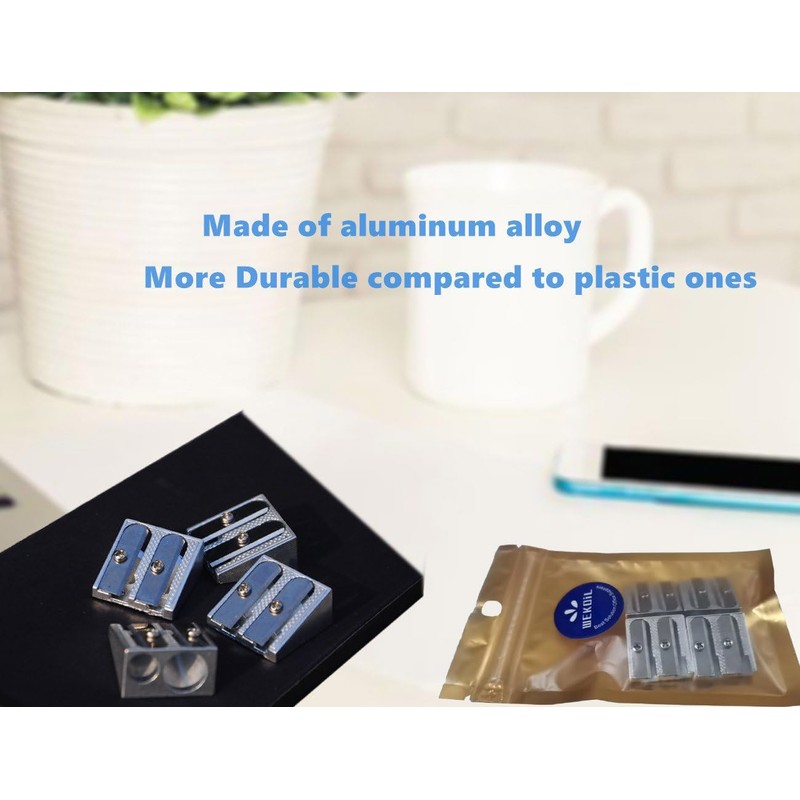 Information From WEKOIL Double Hole Colored Pencil Sharpener The quality of a sharpener, especially the blade, plays a key role in optimum sharpening of wood-clad pencils. Due to their robust and hard leads, graphite pencils can be sharpened to a very thin point.Given their softer leads, colour pencils are sharpened to a shorter and blunter point. For optimum sharpening, Here suggest replacing the sharpener now and then because the sharpener blade will become blunt over time.This results in more tip breakages. Material: Aluminum alloy metal + High-grade Steel. Size:mmxmmx.mm, small hole mm diameter,large hole mm diameter. Application: Suitable for sharpening wood-clad pencils,graphite pencils and colour pencils to thin point. Ideal choice for sharpening the point for creative work,for Artist,Adult,office,home etc. Package: PCs of WEKOIL Manual Metal Pencil Sharpeners.