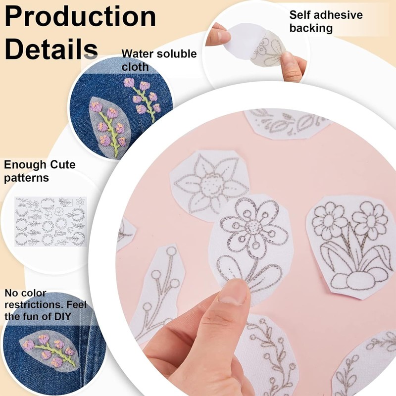 - Easy to use: the patterns on our water-soluble embroidery fleeces are pre-printed. All you need to do is cut out the desired pattern and stick it to the fabric to be decorated. Then you can start embroidering. After embroidery, you just need to rinse it with warm water. After drying, your clothes will have exquisite patterns on them.