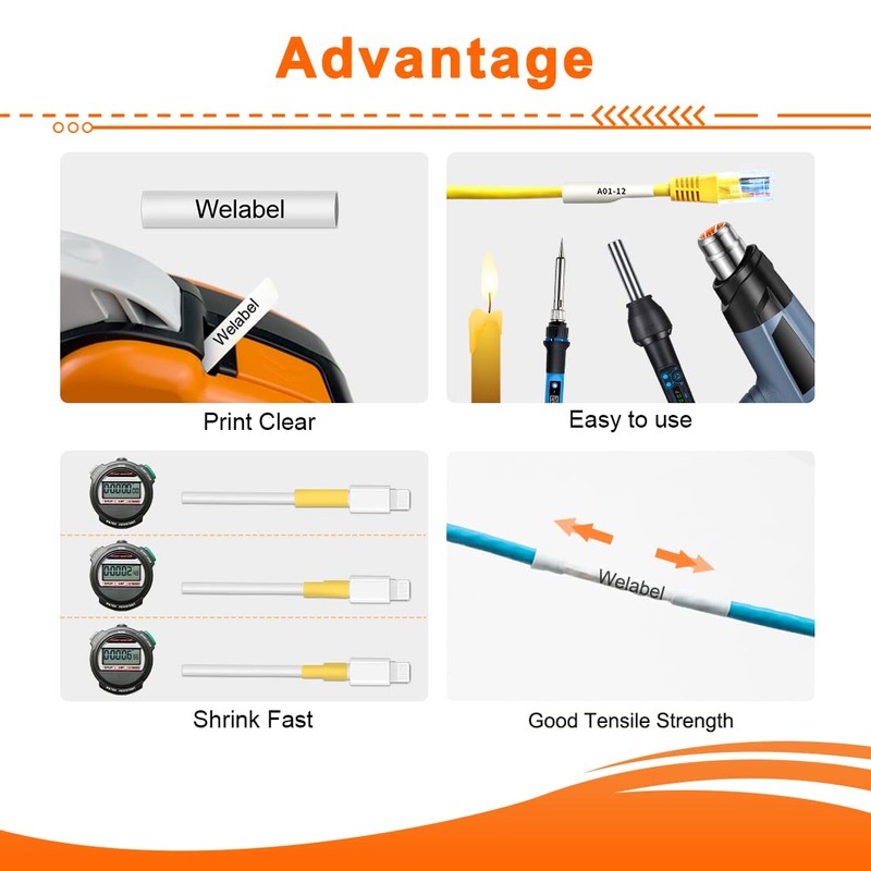 - Advantage: PTouch heat shrink tubing hse-221 is characterized by clear prints and long storage life. They are made of polyethylene and flame retardant materials. They are waterproof, corrosion-resistant and highly insulating. They are safer and more reliable at high and low temperatures and are resistant to UV and oil.
