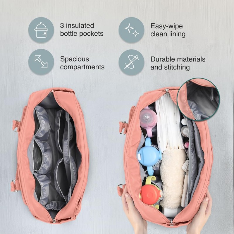 - Spacious & Well Constructed - 1 main compartment and 14 functional pockets, as well as 3 insulated pockets ensure your essentials stay organized without digging around. This wide-open diaper bag can be filled with all baby essentials. Everything from infant outfits to snacks can be kept in order and easy to access, including a key-chain to ensure your keys at your fingertips.