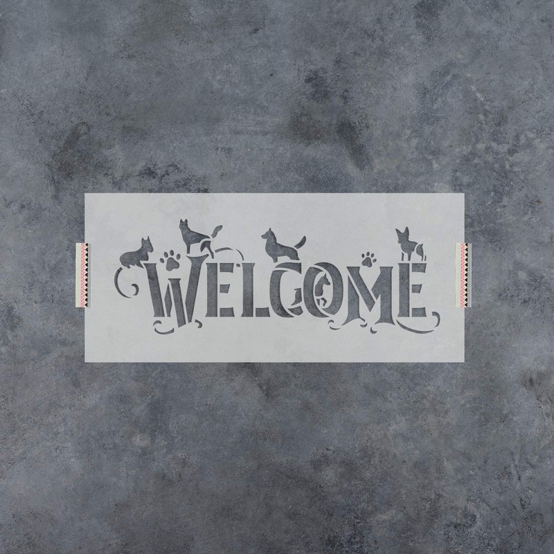 Welcome Dog Sign stencil on reusable 12 mil mylar. Laser cut stencil for crafts and DIY projects. All of our stencils are cut right in the USA and shipped out in 1 business day. We use a thick mylar which will last for hundreds of uses when cleaned and stored properly.