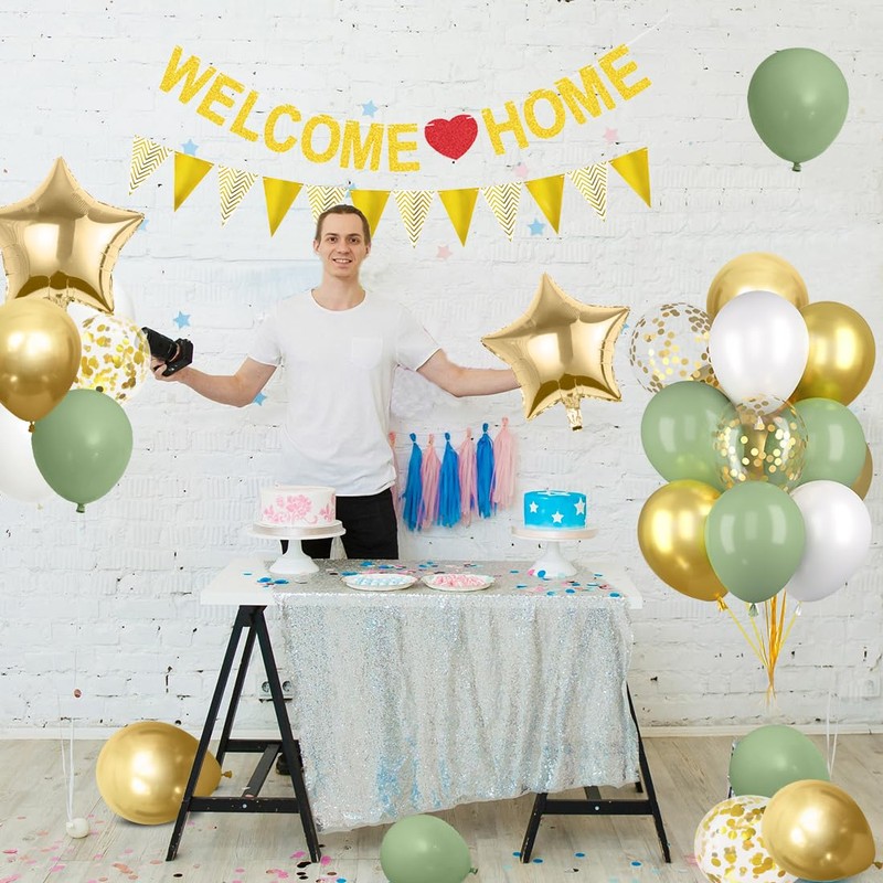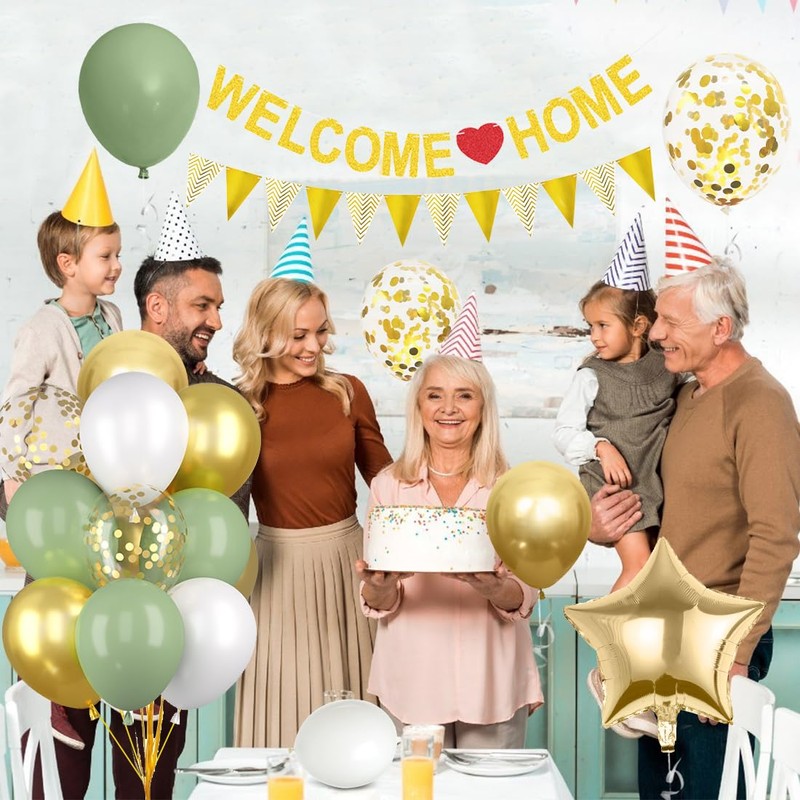 - Welcome home decoration: 1 banner "Welcome Home" 1 golden bunting, 5 green balloons, 5 golden balloons, 5 white balloons, 5 golden confetti balloons, 2 golden star balloons, 1 roll of ribbon.