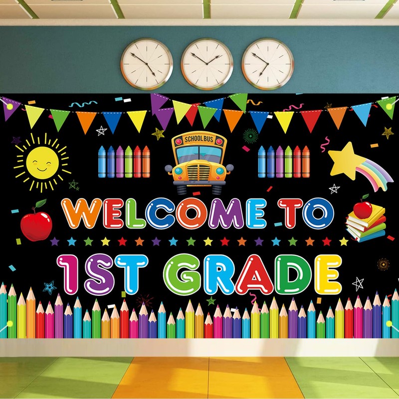 - Ours Welcome to 1st Grade backdrop with colorful letter and pencil, crayon, apple, book,school bus signs and pennant banner, which is suit for hang it on the wall, photo booth or fence to decorate party. perfect for back to school party, first day of school party, school office party or other festivals,etc. It's also an ideal gift for teacher, students, parents, kids, or friends