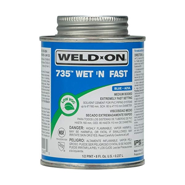 Weld-On 12497 735 Wet 'N Fast Medium-Bodied High Strength PVC Cement - Extremely Fast Setting and Low-VOC, Blue, 1/2 Pint (8 fl oz)
