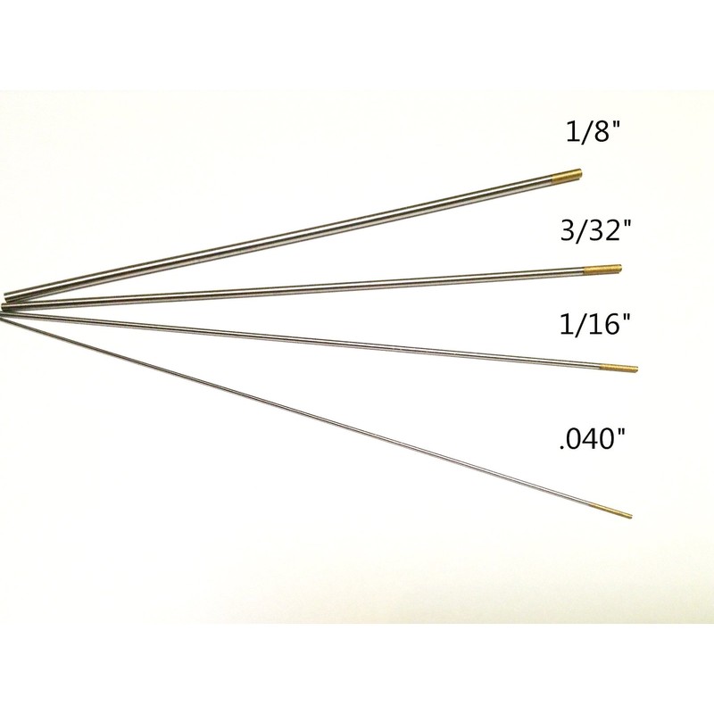 - Available Tungsten electrode diameters: 0.040" (0.5mm), 1/16" (1.6mm), 3/32" (2.4mm), 1/8" (3.2mm) and 5/32" (4.0mm); 7" (176mm) length. Ground annealed.