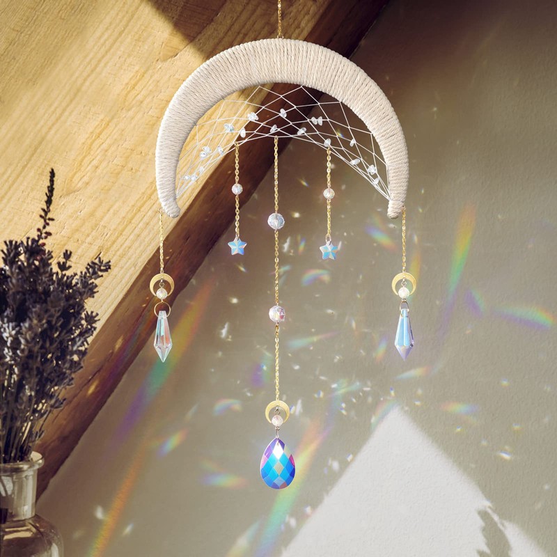 - 🌈 Moon Crystal Suncatcher - 100% Handmade ornament, It adopts a romantic bohemian style, and uses the combination of crystal pendant and moon catcher, which means to protect you every night sleep peacefully, have a good dream!