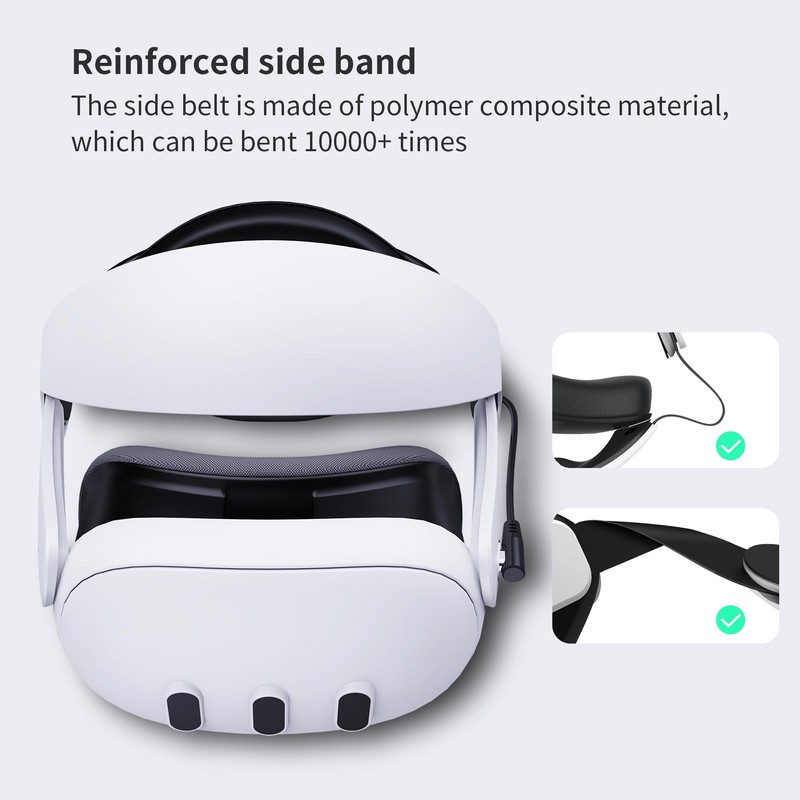 - 【Reinforced Side Strap】The headstrap for oculus quest 3 is made from high-quality ABS + PC eco-friendly materials that are rigorously tested at high and low temperatures for extreme durability and can withstand more than 10,000 bends and twists and recover quickly, so you don't need to worry about the Quest 3 head strap snapping.