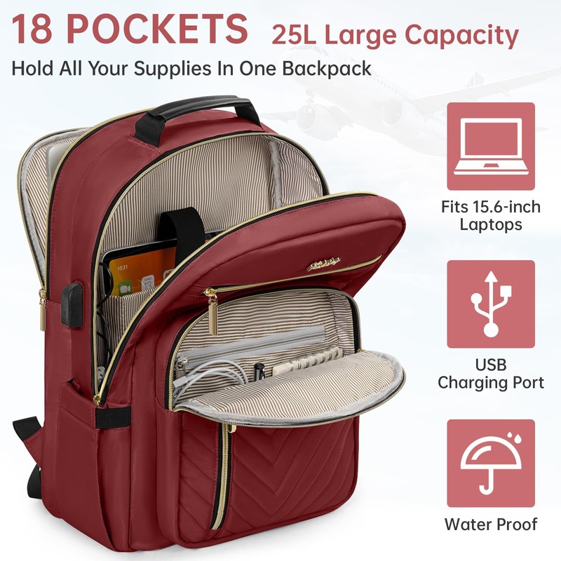 WELIDAY Laptop Backpack for Women, Work Travel Computer Bags, Quilted Casual Daypack with USB Port, Waterproof Computer Backpack Fit 15.6 Inch Laptop (Maroon Red)