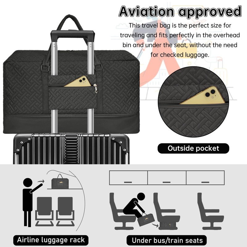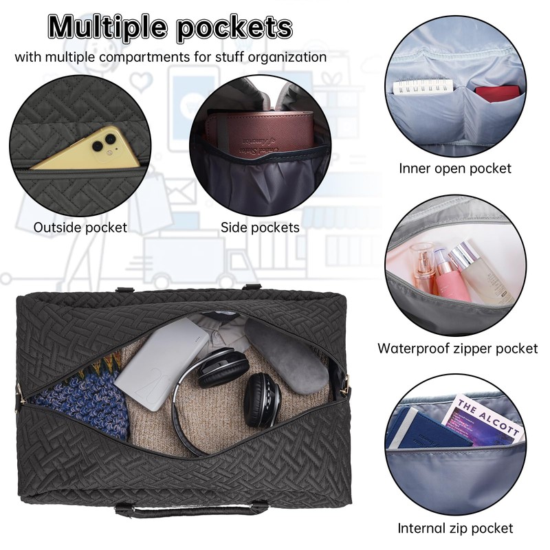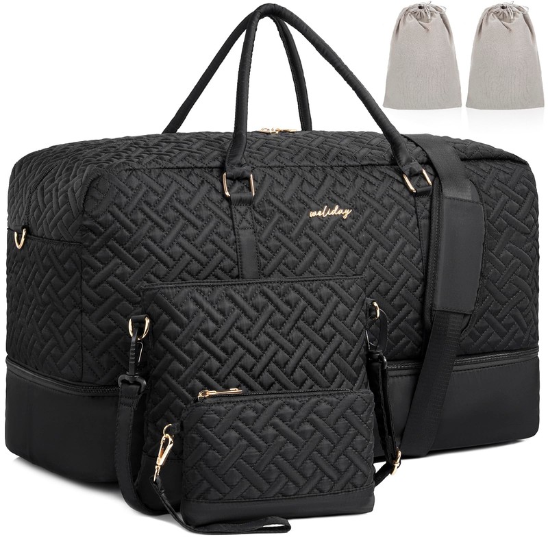 • 【WELIDAY Weekend Travel Bag】5 PIECE SET Includes: large weekend travel bag, crossbody bag, toiletry bag, 2 high-quality flannel shoe bag. And equipped with 2 adjustable comfortable shoulder straps. There is enough space for your weekend trips, short business trips and daily travel