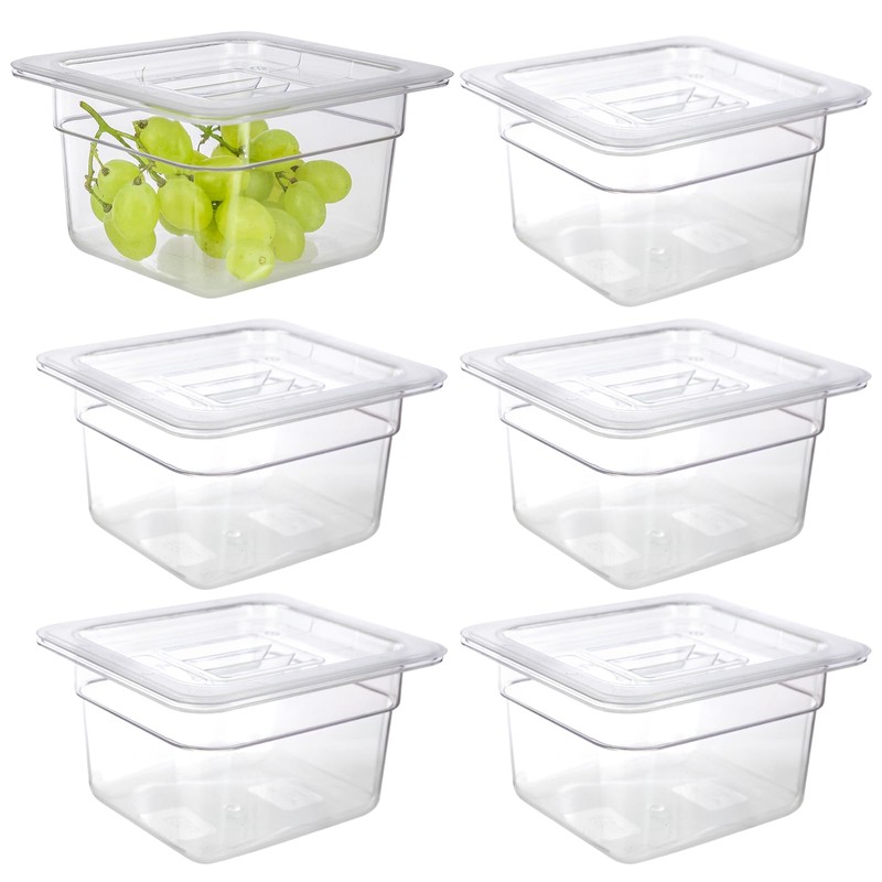 • MULTI SIZE FOR CHOICE:1/6 Clear food pans with three depth options; 2.5 inch 1.1QT perfect for dressings spices and deli items; 4 inch 1.62QT ideal for fruits salads and meal prep; 6 inch 2.35QT fits entrees soups and bulk ingredients; ideal for homes schools restaurants hotels fast food outlets canteens supermarkets bazaars