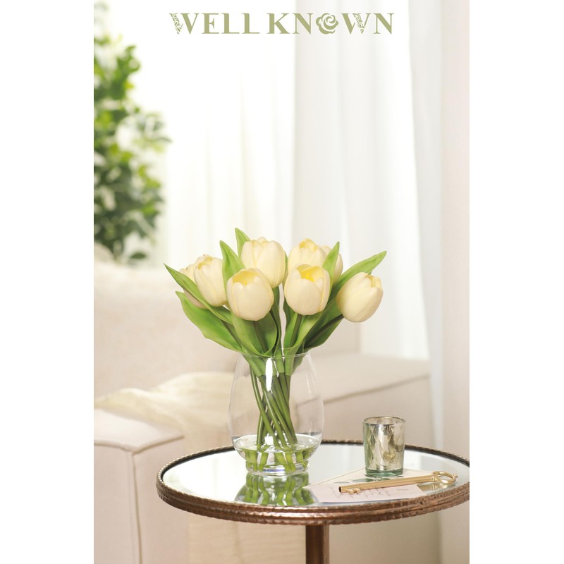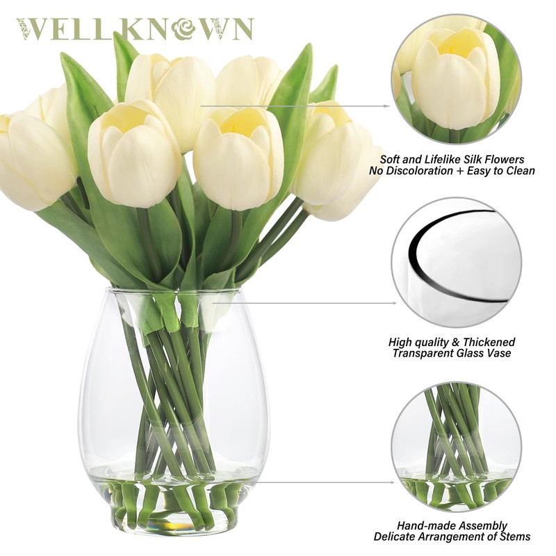 WELL KNOWN WELL KNOWN 12 Pcs Tulips Artificial Flowers in Vase, Real Touch Tulips with Vase with Upgrate Acrylic Water Flower Arrangements Centerpiece for Dining Room Table DecorationCream