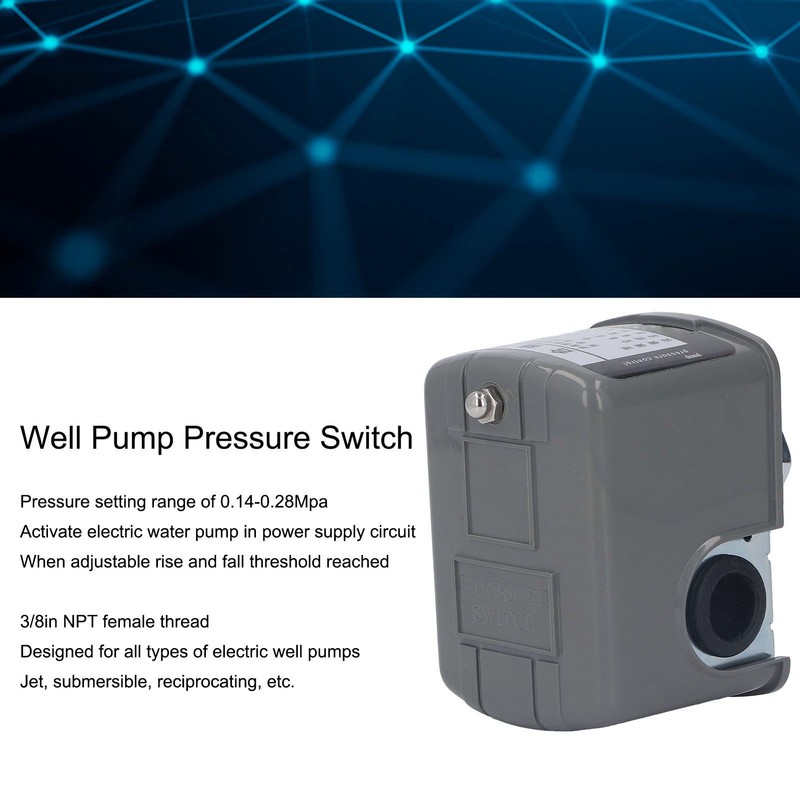 1、WATER PRESSURE CONTROL: This is a pump pressure control switch for perfect pressure control, useful and practical 2、ADJUSTABLE PRESSURE: A pressure switch with a pressure setting range of 0.14‑0.28Mpa activates the electric water pump in the power supply circuit when an adjustable rise and fall threshold is reached 3、WIDELY USED: 3/8in NPT female thread, standard well pump replacement switch, designed for all types of electric well pumps, such as jet, submersible, reciprocating, etc. 4、DURABLE MATERIALS: Pressure control switches are made of excellent materials for high strength and durability. Large contacts for extended service life open when pressure rises 5、EASY TO USE: Water pressure control is easy to use, stable performance, protect motor, save electricity, can be used for a long time