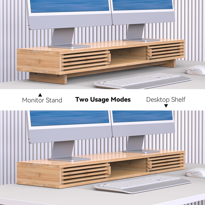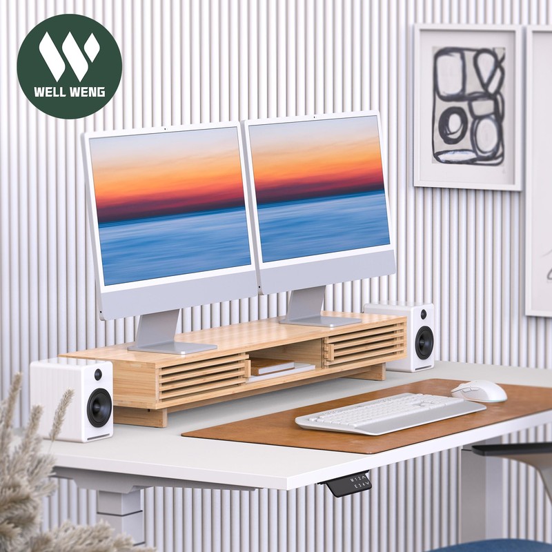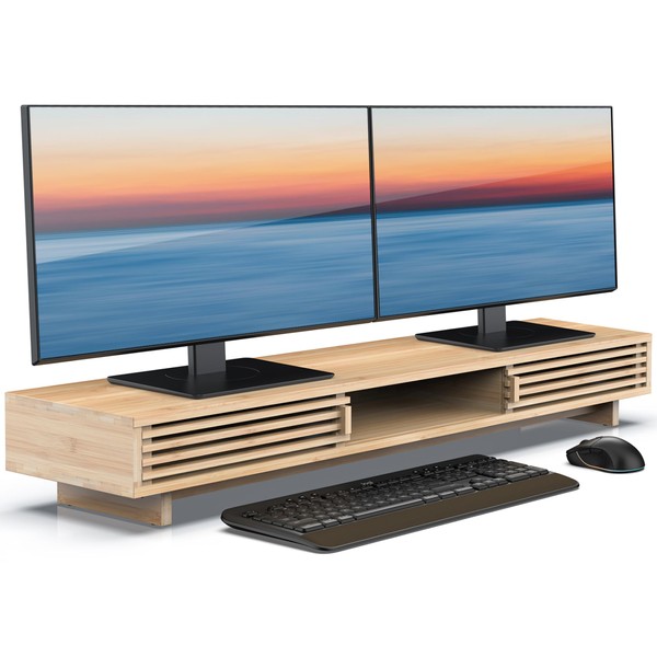 WELL WENG Monitor Stand Riser with Sliding Door, Desk Shelf (Natural Bamboo, 38 Inch)