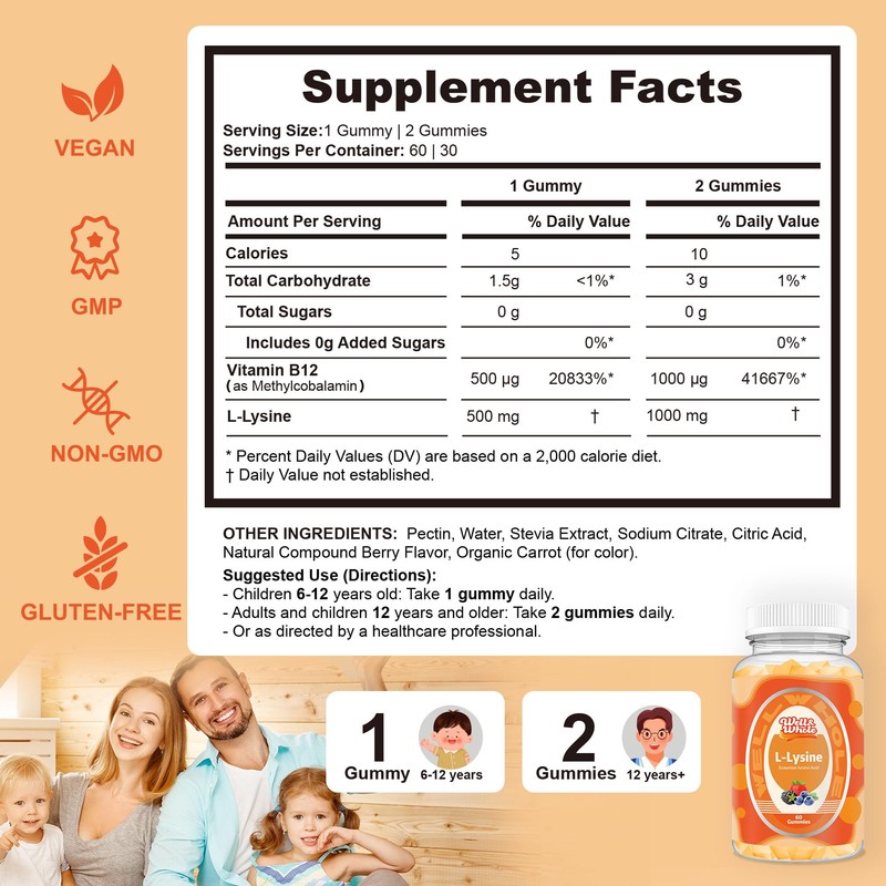 - Well&Whole L-Lysine 1000mg Gummies: Each 2 gummies contains 1000mg of L-Lysine with vitamin B12 1000mcg.