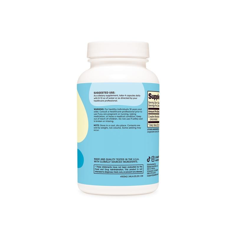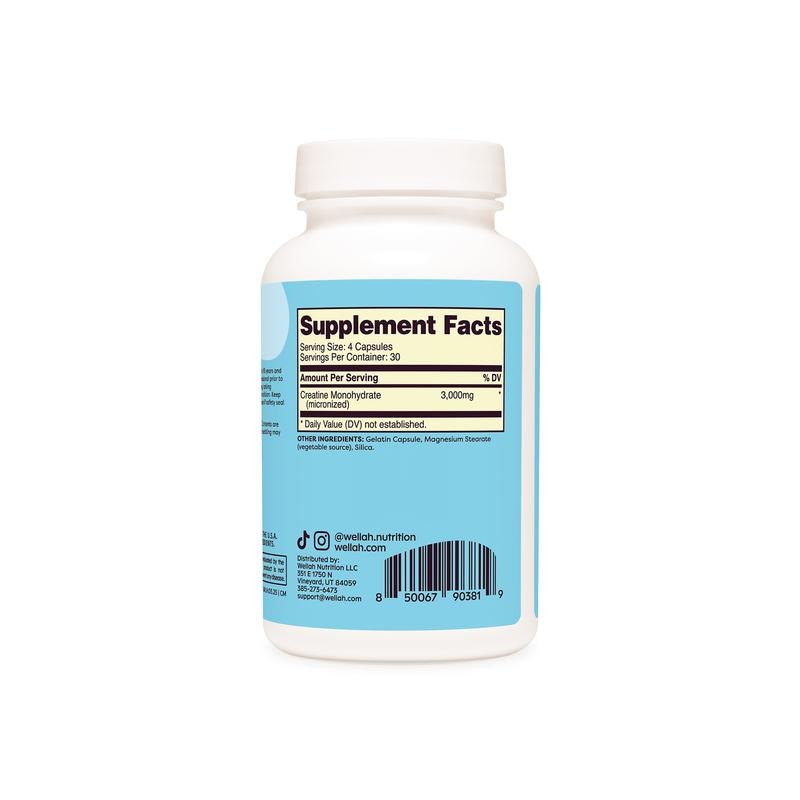 Wellah Creatine Capsules deliver 3 g of pure creatine monohydrate per serving, the most studied form of creatine for boosting strength, endurance, and overall performance. Designed for adults of all activity levels, this supplement supports lean muscle growth, explosive power, and faster recovery, helping you train harder and perform at your best. With 30 servings per bottle, Wellah Creatine ensures consistent, science-backed support for energy, muscle function, and workout recovery. Produced in a GMP-compliant, NSF-certified facility and third-party tested for quality and purity.