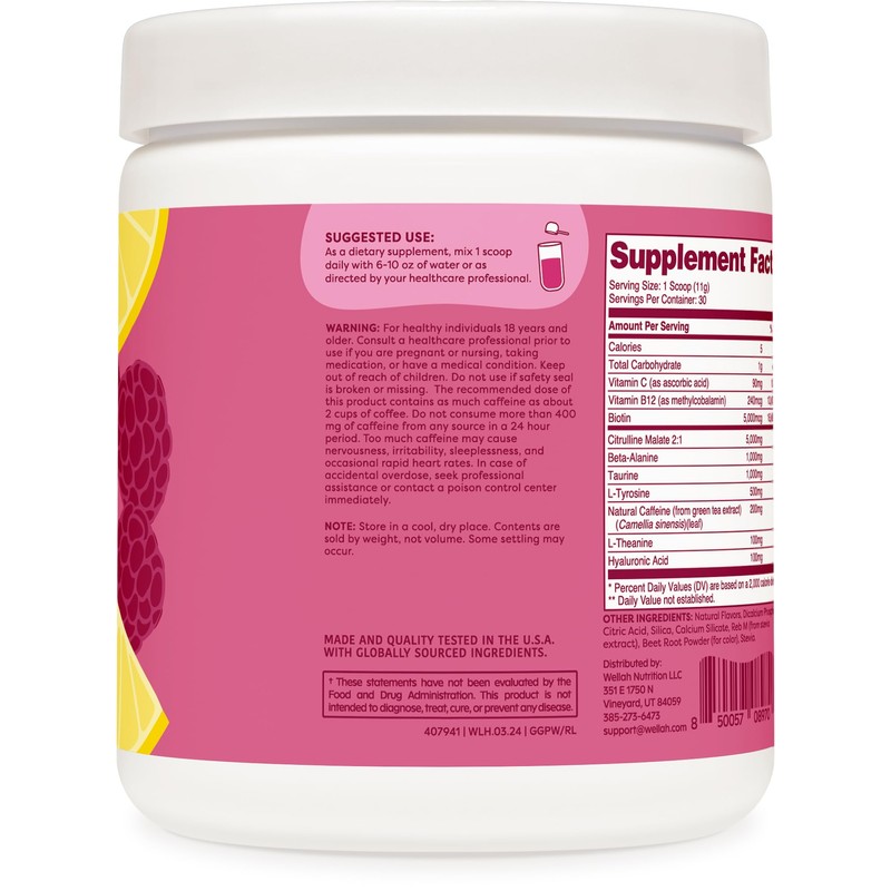 Prepare to power up your workouts with Wellah's Get-Going Pre-Workout Drink Mix in the tantalizing Raspberry Lemonade flavor. Sweetened with Stevia for a naturally refreshing taste, this pre-workout blend is designed to fuel your fitness journey. Each bottle contains 30 servings of invigorating energy, with 200mg of natural caffeine per serving to kickstart your workout routine. Crafted in an NSF Certified GMP Compliant facility, every batch undergoes rigorous third-party testing by independent ISO-accredited laboratories, ensuring quality, purity, and safety you can trust.
