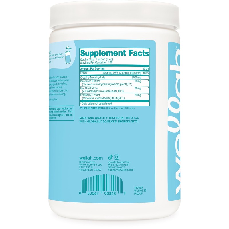 Wellah Pump-It-Up Creatine offers 100 servings of creatine monohydrate combined with a unique blend of dandelion, uva ursi, and cranberry extract. With no added flavors, it's a great addition to your routine. This product is manufactured in an NSF certified, GMP-compliant facility and is third-party tested for quality assurance.