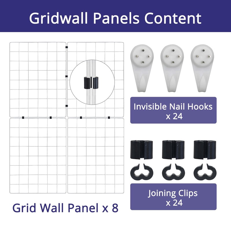 - 【PARCEL CONTENTS】 The product package contains 8 grid panels, hooks and clips, with a single metal grid wall panel area of 1.29 sqft, and four pieces of 10.3 sqft. This opens up many possibilities for creative expression.