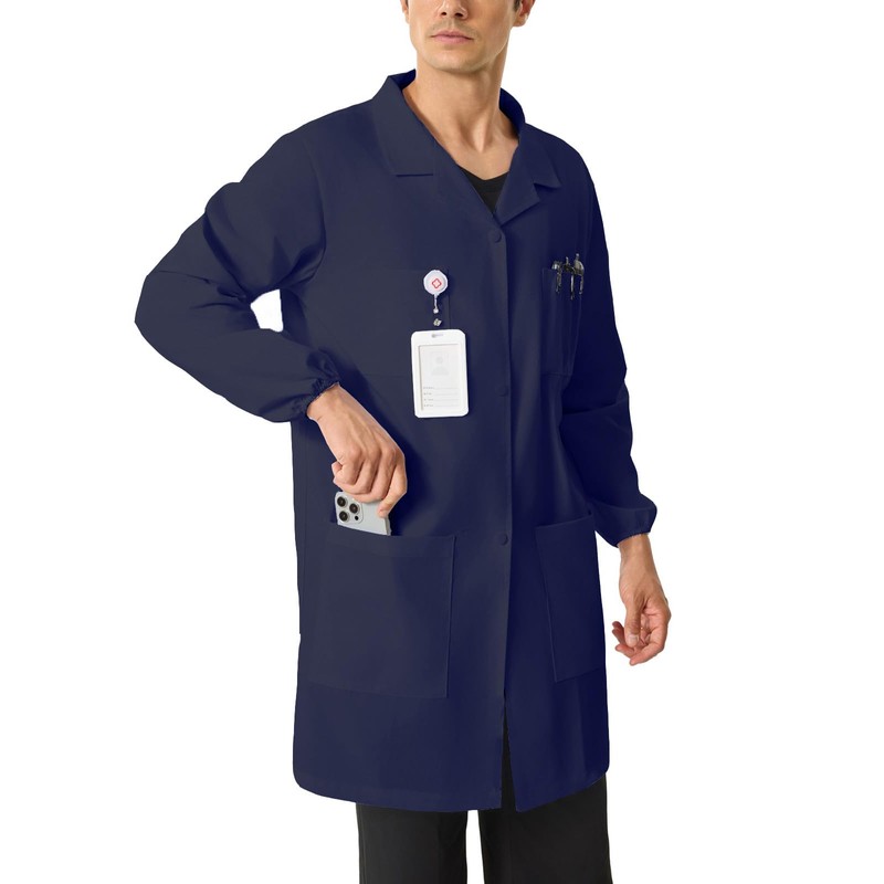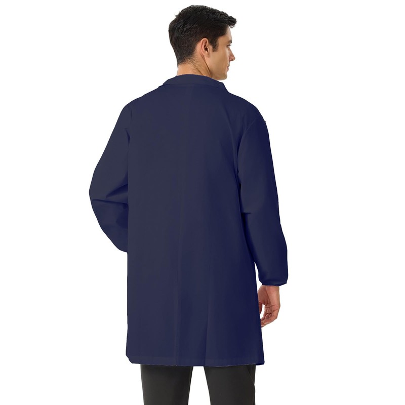 Wellhin Men's Navy Blue Lab Coats Snap Closure 4 Pockets Elastic Cuffs Professional Medicas Long Sleeve Labcoats Scientist College M
