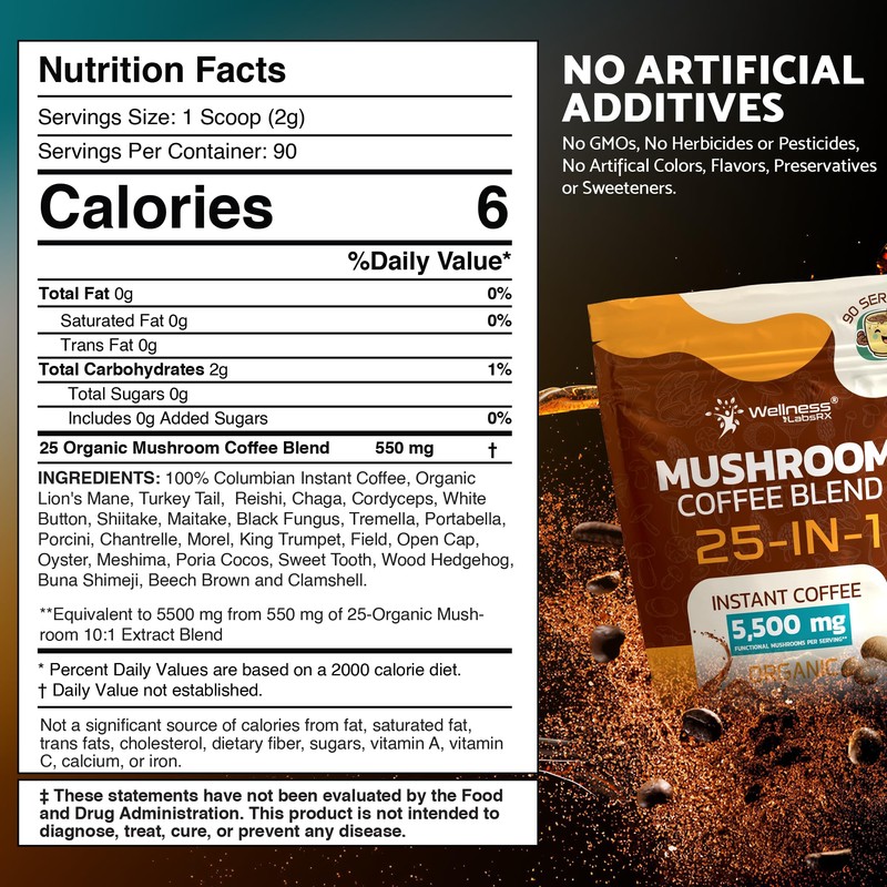 • SAFETY QUALITY & POTENCY: WellnessLabsRX follows the strict standards of quality ingredients and offers a wide range of nutritional supplements. Our Mushroom Coffee powder is all-natural, non-GMO, Gluten-free, GMP-certified, and does not contain any harmful chemicals.