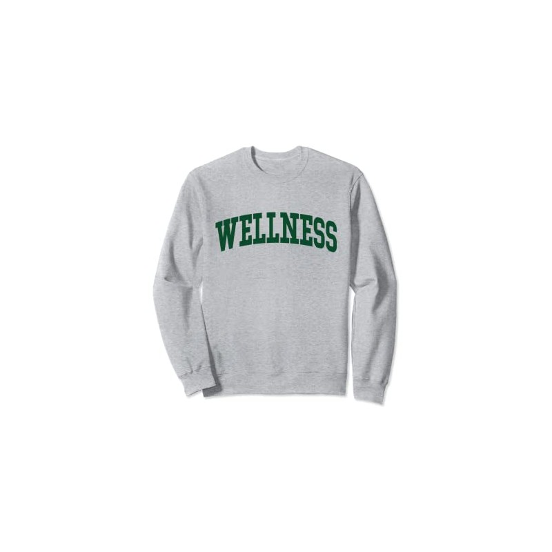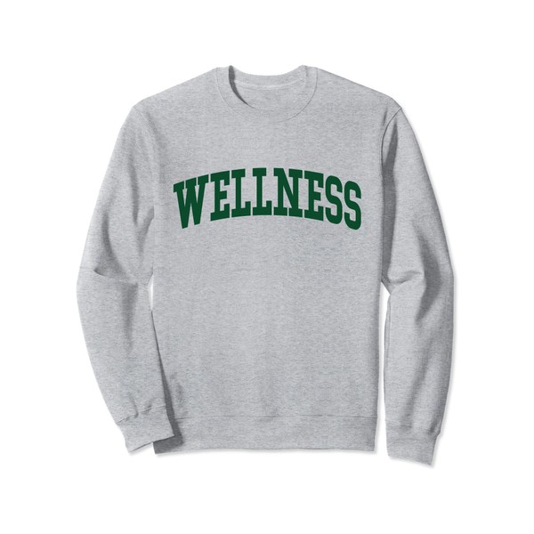 • Wellness written in bold green college athletic varsity font over a light gray background. Minimalist, chic design that will give you a cozy but sporty aesthetic.