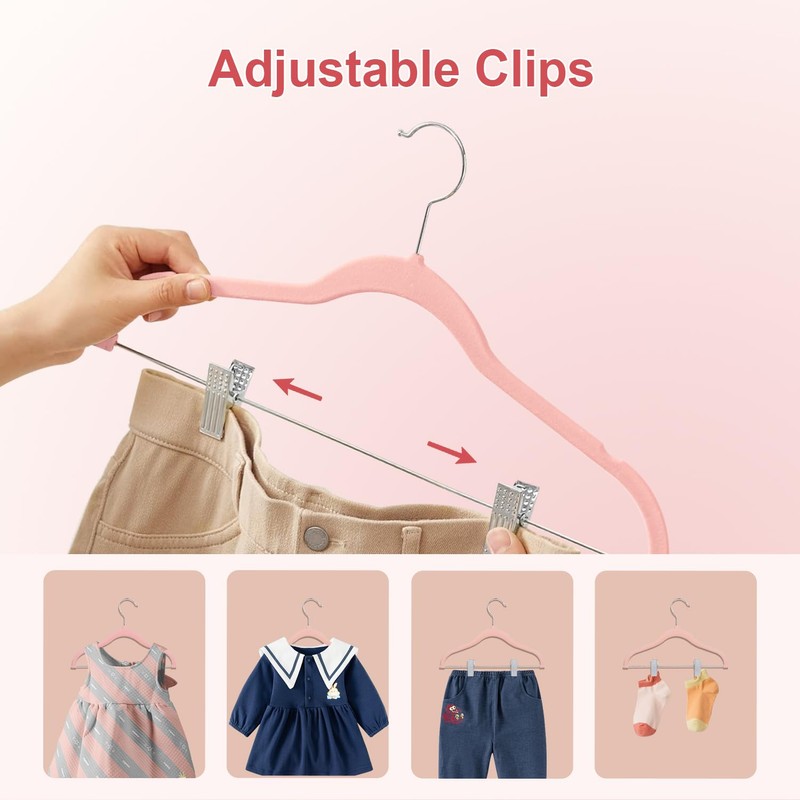 Wellong Baby Clothes Hangers with Clips, 14 Packs Kids Velvet Clothes Hangers, Heavy-Duty Childrens Hangers, Storage Organizer Clothing Hangers for Shirts, Pants, Skirts, Dresses, Jackets, Coat Pink