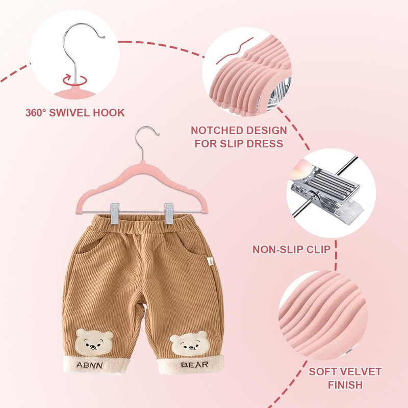 - FLOCKED VELVET FINISH - Fine soft velvet finish on the baby hangers, very soft finish to prevent your baby's clothes from scratches, and also protects your baby's clothes from slipping off from hangers. 360-degree swivel hooks allow you to easily sort out your clothes from any angle in your closet.