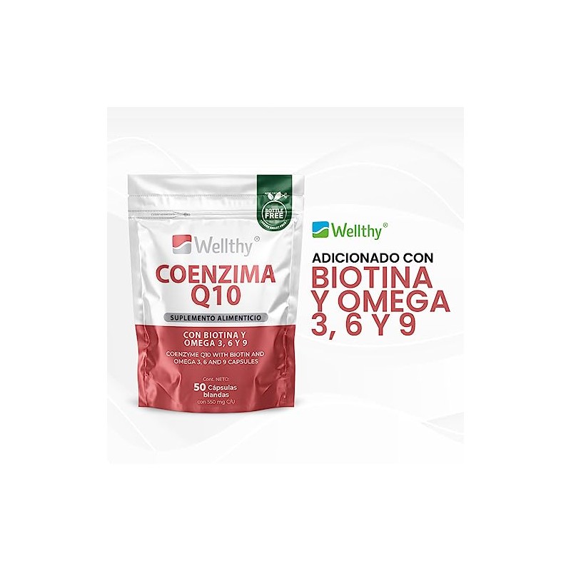 🌟 ⭐ Wellthy Coenzima Q10 100 Cápsulas. Co Q1030mg. Reforzado con Biotina, Omega 3, 6 y 9. 100 Porciones por Envase, Softgel, Bottle Free. ⭐ 🌟