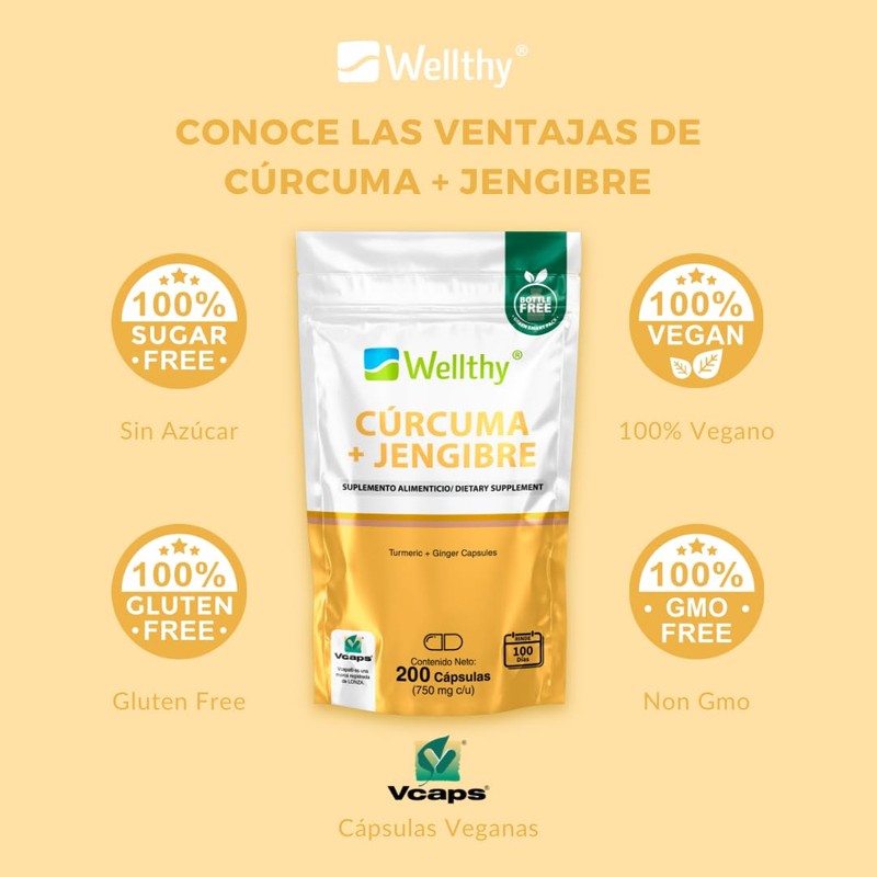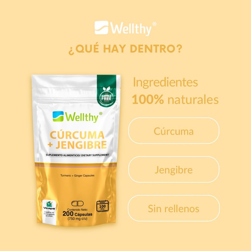Wellthy Cúrcuma y Jengibre 200 Cápsulas. Cúrcuma 750mg, Jengibre 750mg, 100 días de consumo por envase, VCaps Cápsulas Veganas, Bottle Free.