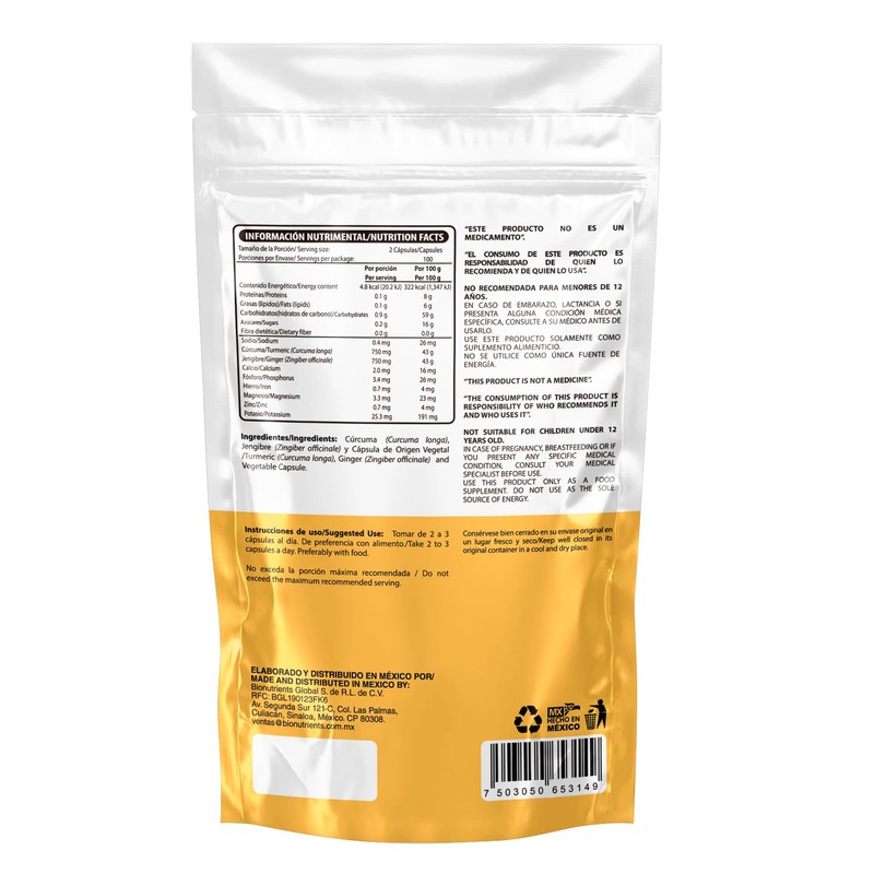 - Sólo Ingredientes esenciales: solo Jengibre y Curcuma como ingredientes, 1500mg por porción. Sin ingredientes relleno