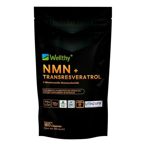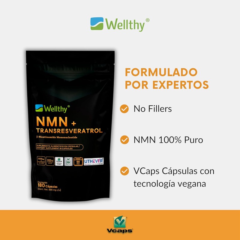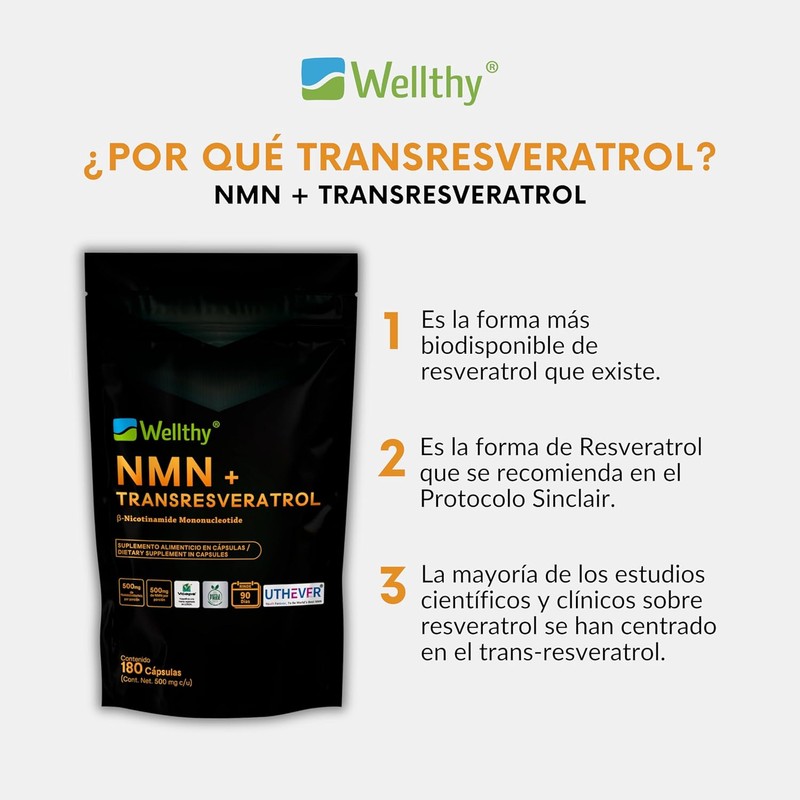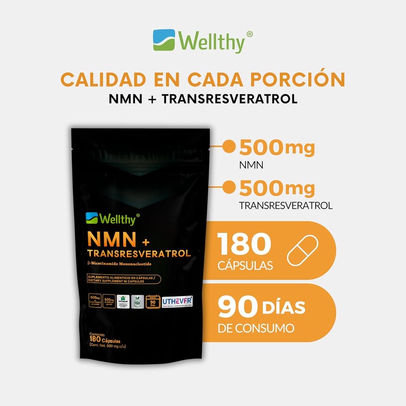 Descubre la combinación perfecta para apoyar tu vitalidad y bienestar con Wellthy NMN (Nicotinamida Mononucleótido) y Trans-Resveratrol, dos de los ingredientes más estudiados en el campo de la salud celular y la longevidad.