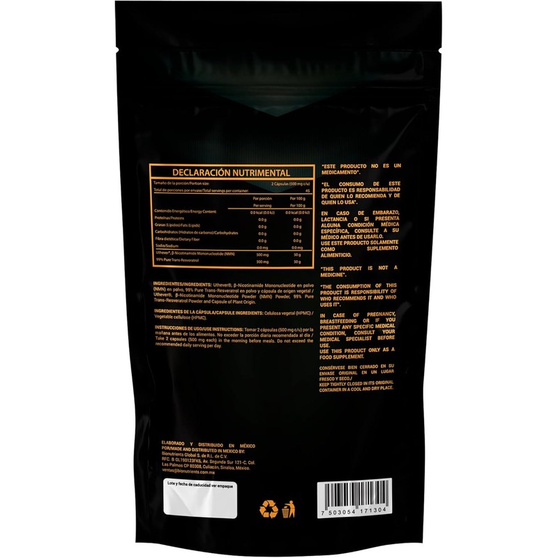 Potencia tu vitalidad con la combinación sinérgica de NMN y Trans-Resveratrol, diseñada para apoyar tu energía, tu salud celular y tu bienestar a largo plazo.