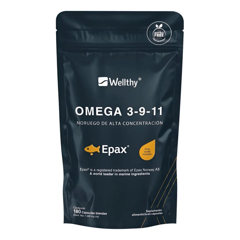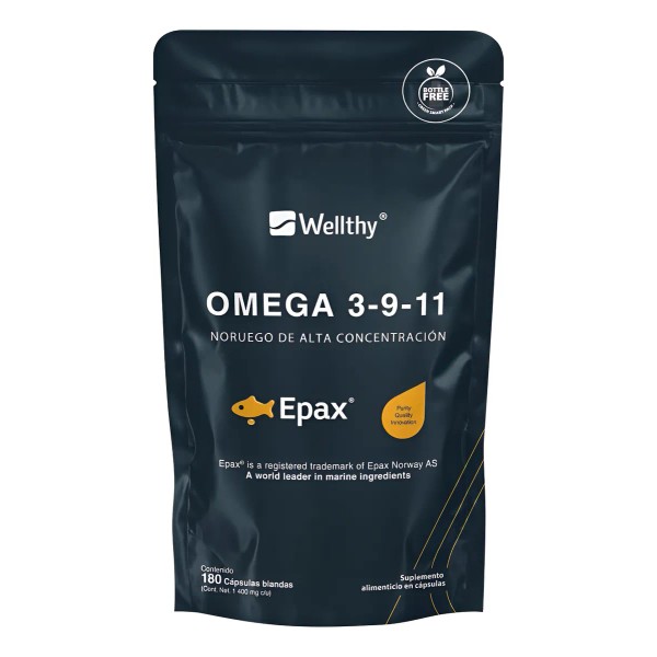 El Omega 3-9-11 Epax de Wellthy es un suplemento premium de ácidos grasos esenciales, elaborado con aceite de pescado de alta pureza y calidad Epax®, reconocido internacionalmente por sus procesos de refinamiento que garantizan máxima concentración y pureza.