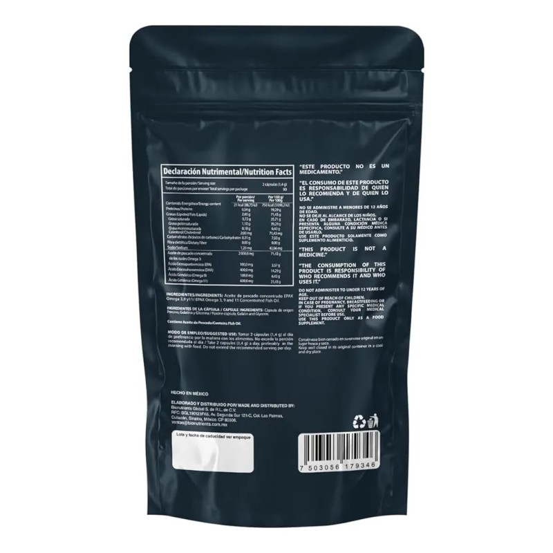 Cada porción aporta 1000mg de EPA y 400mg de DHA, los ácidos grasos más estudiados y respaldados por la ciencia, fundamentales para el funcionamiento óptimo del corazón, la salud cerebral, la visión y las articulaciones. Además, contiene Omega 9 y 11, que complementan la fórmula aportando un perfil lipídico completo para la salud metabólica y cardiovascular.