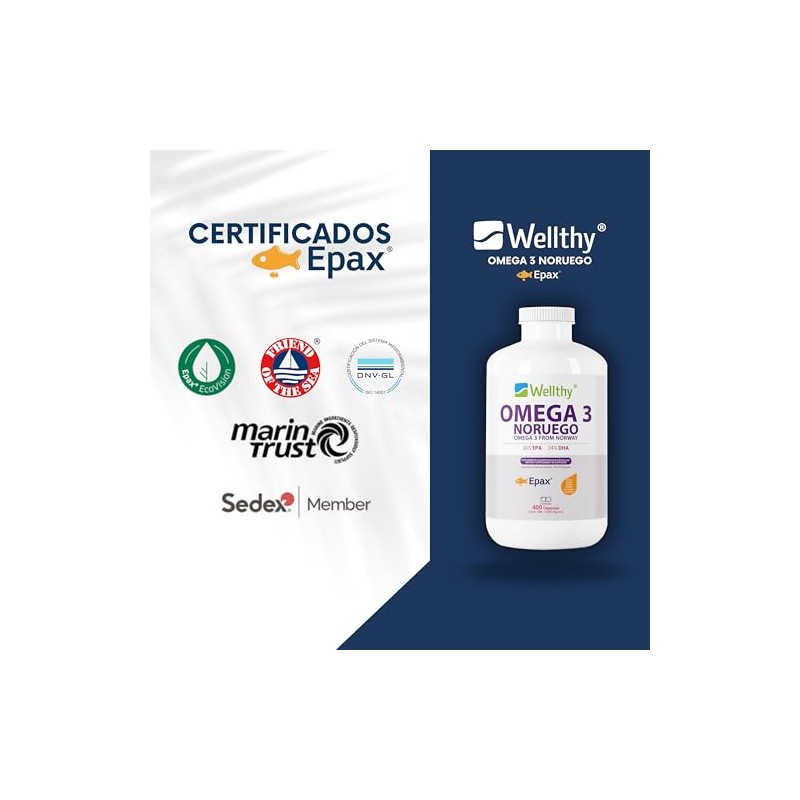Wellthy Omega 3 Noruego Epax® 400 Cápsulas. El aceite de pescado Epax® está ultraconcentrado en omega 3 con un 36% de EPA y un 24% de DHA. Cápsula de Gelatina Blanda.