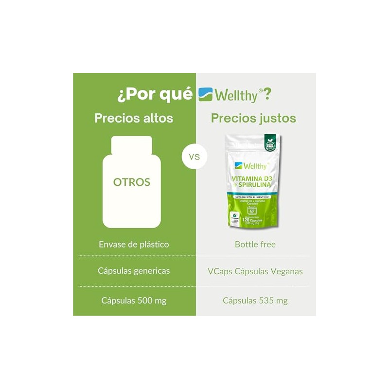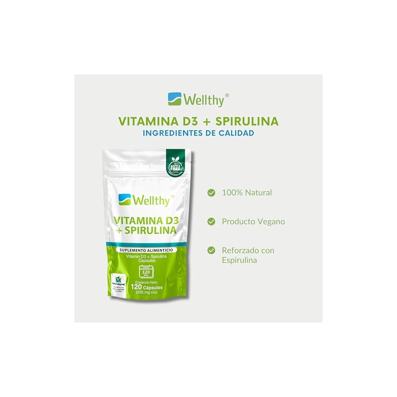 Wellthy Vitamina D3 400 unidades + Espirulina 120 Cápsulas. Reforzado con 535mg de Espirulina, VCaps Cápsulas Veganas. Bottle Free.