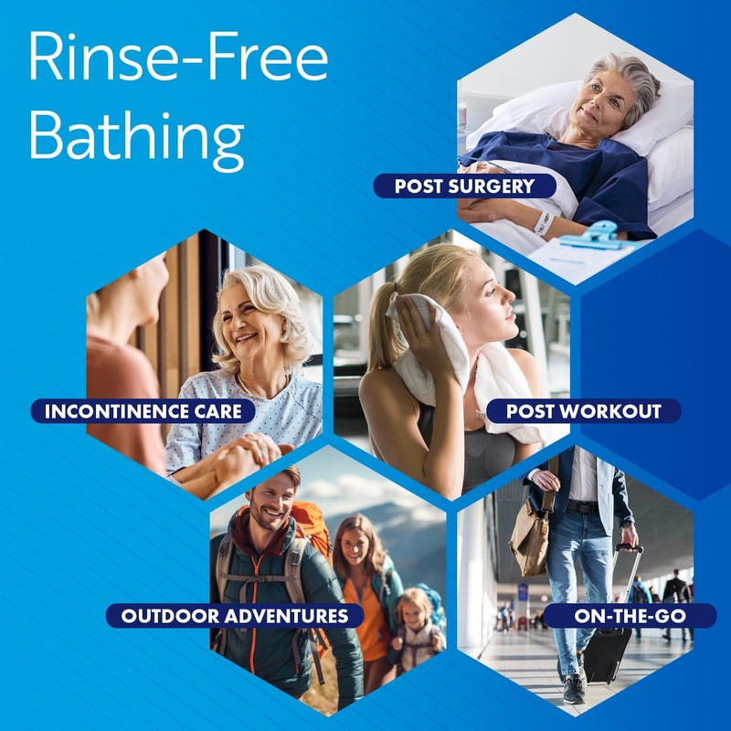 - Strong, Durable, Ultra Soft: Strong and durable rinse-free cleansing wipe that makes daily bathing and clean up quick, convenient, refreshing and safer than a shower stall or bathtub. Can be used for incontinence care, after a workout, camping, post surgery or anytime where bathing is not practical. No water or rinse required.