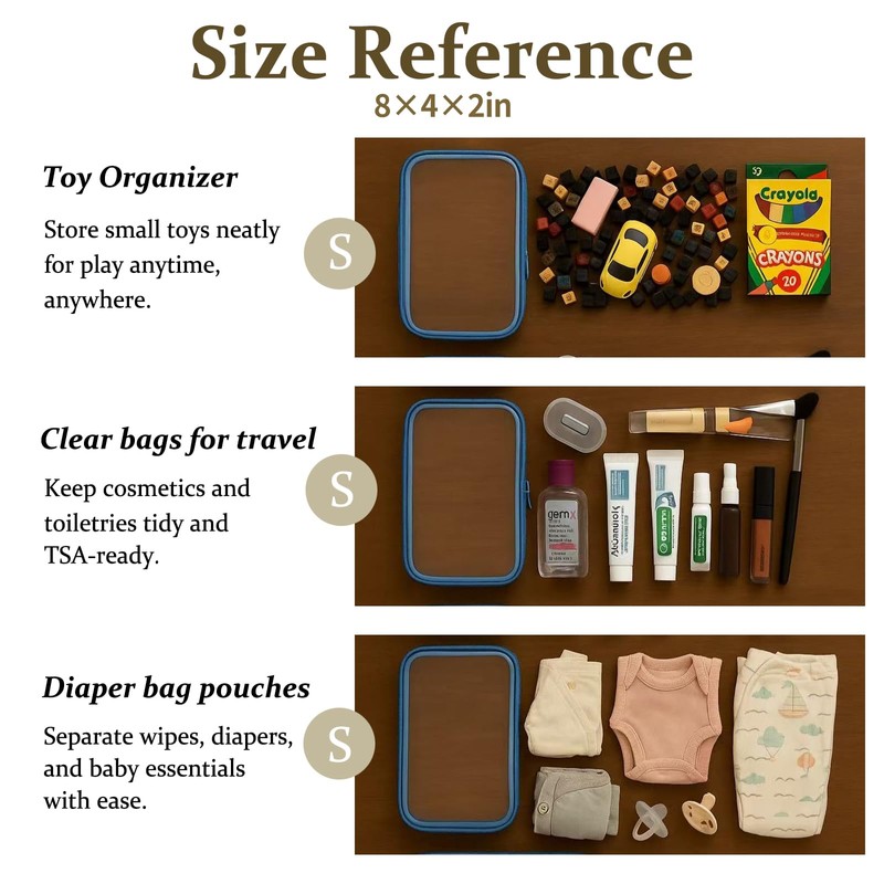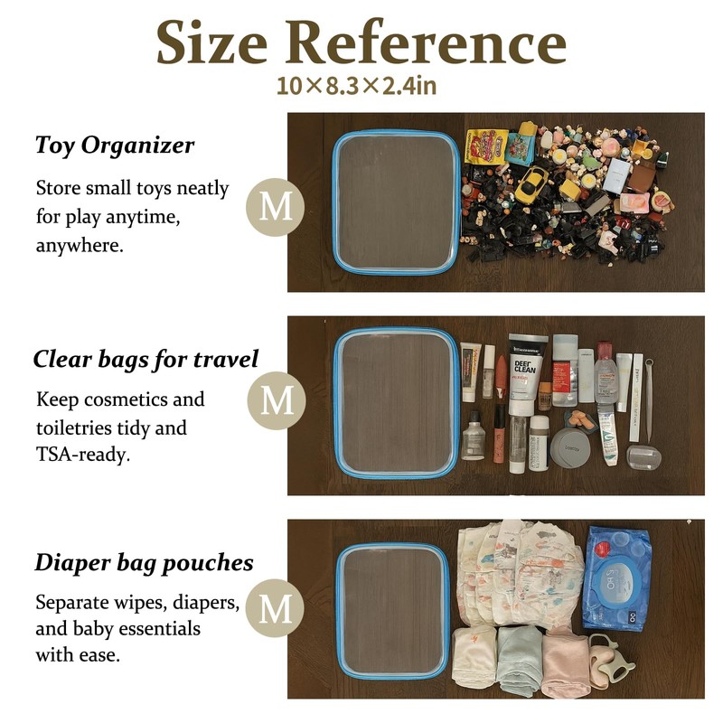 - Multi-Use Storage for Daily Essentials. Perfect as a bag organizer for makeup, toiletries, charging cables, pens, or travel-size items. Whether at home or packing a diaper bag, these clear zipper pouches help sort small items with ease.