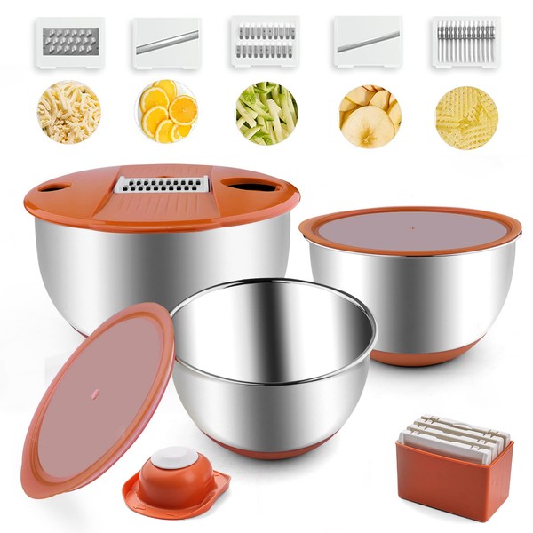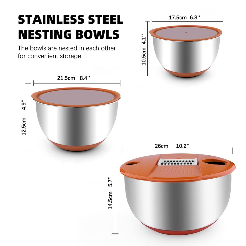 weltonhm Mixing Bowls with Lids Set,3 Pieces Stainless Steel Nesting Bowls Vegetables Slicer Non-Slip Mixing Bowl for Baking Prepping Cooking(Orange)