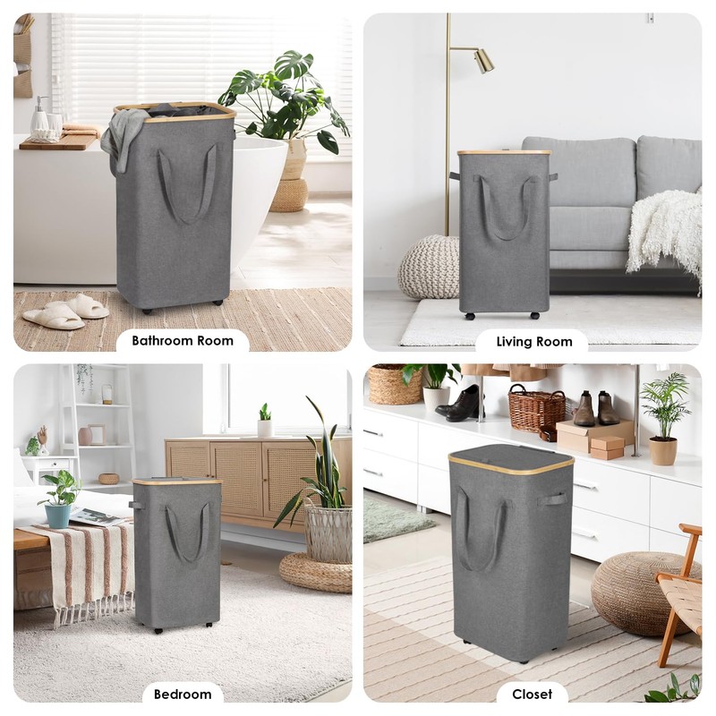 WELTRXE Gray Laundry Hamper with Lid and Wheels, 110L Large Rolling Laundry Basket with Extended Handles Foldable Dirty Clothes Hamper Wheeled Narrow Corner Clothes Bins for Bedroom Dorm Laundry Room