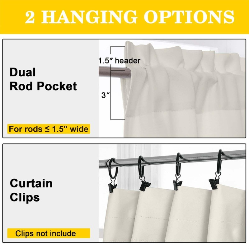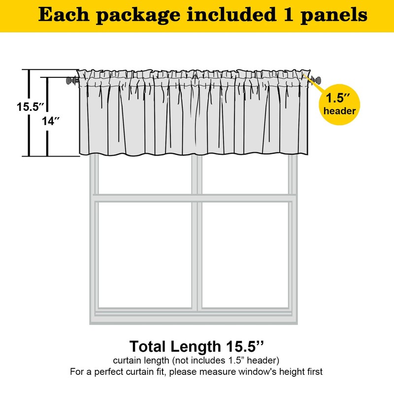 - Ready Made: Each package include 1 panel of natural valance curtains. Each panel measures 60"W x 14"L. The natural kitchen valance have 2 hanging options (Rod pocket & Clip Style) with a 3-inch rod pocket to fit 1.5-inch rods. Multiple colors and sizes are available to meet your preferences