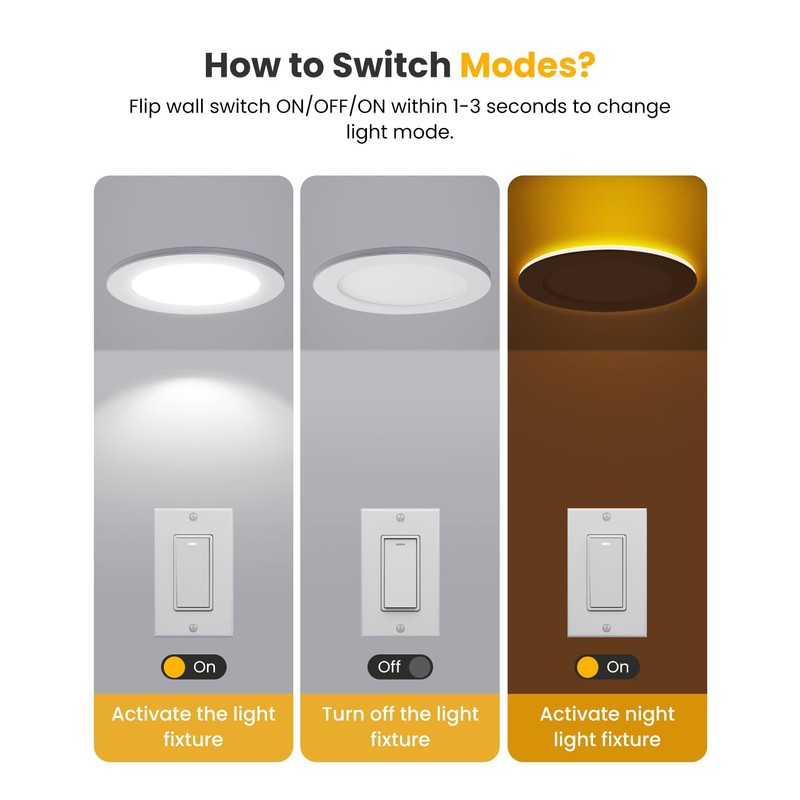- Dual-Mode Switching: The light automatically starts in downlight mode after installation. Switch it off and on quickly to shift to nightlight mode. To reset, turn off the nightlight, wait 5 seconds, then power on