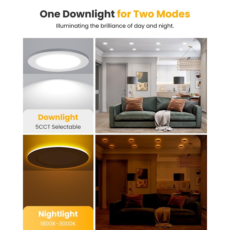 - Dual-Mode Dimming : Achieve seamless brightness control (5%-100%) in both downlight and nightlight modes. Compatible with most dimmers for flicker-free, customizable ambiance in living spaces or workspaces.