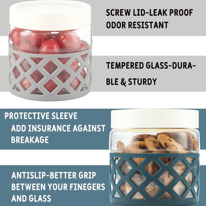 wemburly 2Pack Glass Meal Prep Containers Reusable with Leak Proof Lids and Protective Silicone Sleeves24OZ Glass Food Storage With Lids Lunch Containers For Adults Dishwasher Safe|Grey+Blue