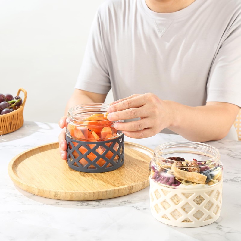 - Durable Design Protective Sleeve: Borosilicate glass lunch containers for adults with leak-proof lid. An extra thick silicone sleeve protects the lunch containers from chips and breaks. The silicone base increase the container's antislip-Better grip between your finegers and glass. The size is convenient to carry for work, picnic, and travel. It is available for you to put our glass containers as lunch box into your backpack. Silicone sleeve easy to take off and put on when wet. Each pack includes 2 pieces borosilicate glass containers . Capacity:700ml/24oz/3CUP Dimensions:4.7" X 4.3"