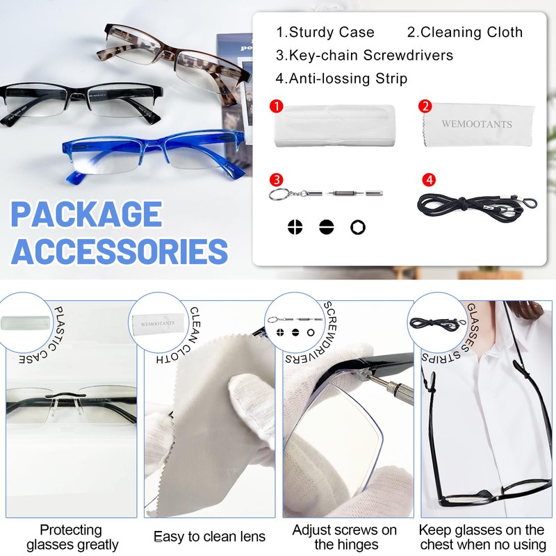 - Adorable package - 4 pairs of readers 3.50 for men women will arrive in their exclusive brandy box. With cute accessories - soft cleaning cloth, hard cases, key-chain screwdriver to adjust screws on hinges, black string to hang the readers on the chest avoid losing.