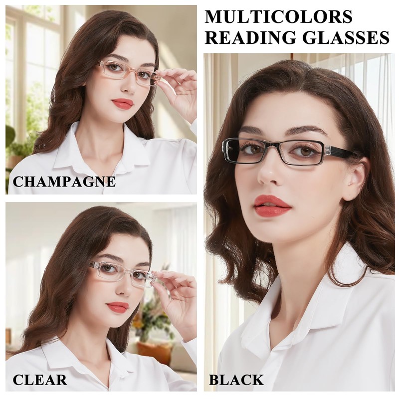 - [Multicolor & Narrow Style] With 3 distinct color options, you've got a perfect pair for any outfit or setting. Whether it's a professional office look, a casual weekend vibe, or a special event, there's a readers to match. Solid black exudes sophistication and authority, warm champagne creates a feminine, approachable charm, modern transparent emphasizes effortless cool and contemporary flair. Narrow rectangular shape flatter various face shapes, don't look over-the-top